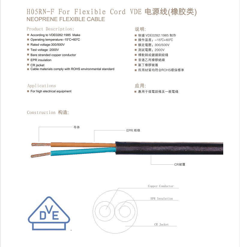 欧式VDE认证 H05RR-F 橡胶线规格如下: