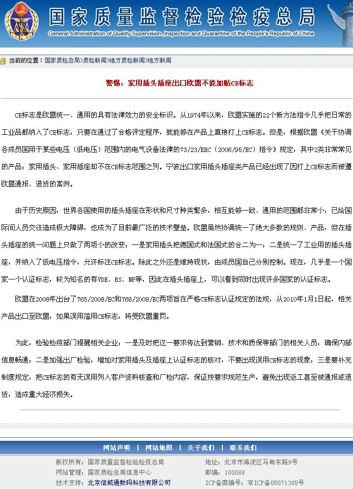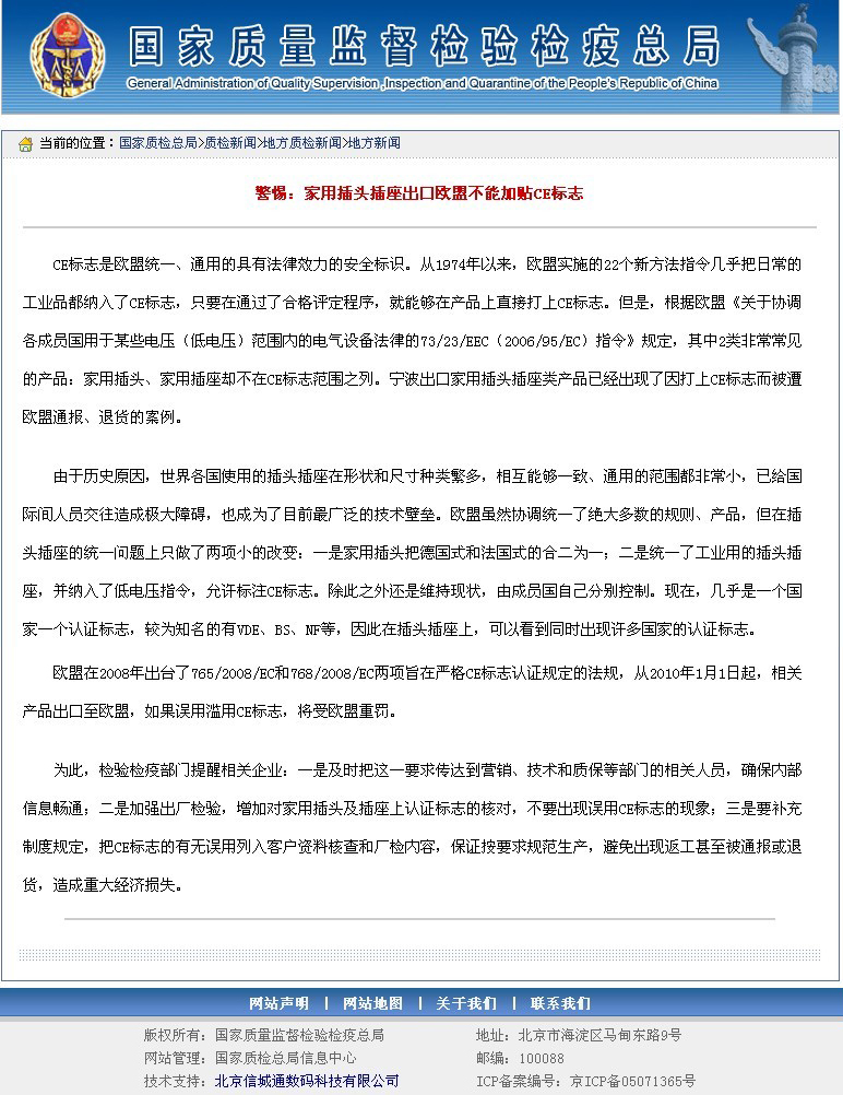 余姚市精益电子有限公司友情警示新老客户,按国家质量监督检验检疫总局的通知,欧式电源线插头不得出现CE标记,以下为引用全文。